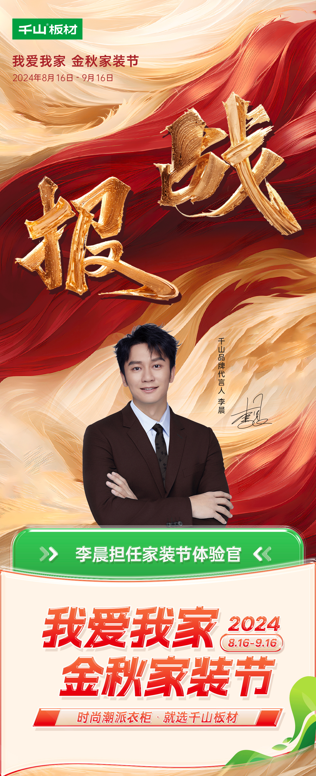 2024年,隨著全國(guó)巡展以及品牌全國(guó)行的火熱進(jìn)行,千山板材快速出圈,形成了線上+線下百萬(wàn)級(jí)的流量曝光,不斷發(fā)酵的品牌熱度,吸引了廣大消費(fèi)者的關(guān)注。為此,千山板材發(fā)起“我愛(ài)我家”金秋家裝節(jié)活動(dòng),花式寵粉,打造品牌狂歡盛宴。,時(shí)長(zhǎng)00:198月16日-9月16日千山金秋家裝節(jié)全國(guó)門(mén)店聯(lián)動(dòng)百萬(wàn)超級(jí)福利 千萬(wàn)家裝補(bǔ)貼多