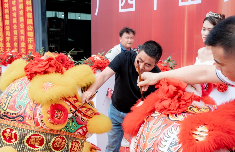頓興明總經理和于常成總經理共同為開業醒獅點睛。禮花漫天,喜氣洋洋,醒獅歡騰,大吉大利!栩栩如生的雄獅,象征著廣西生產基地紅紅火火,前程似錦!