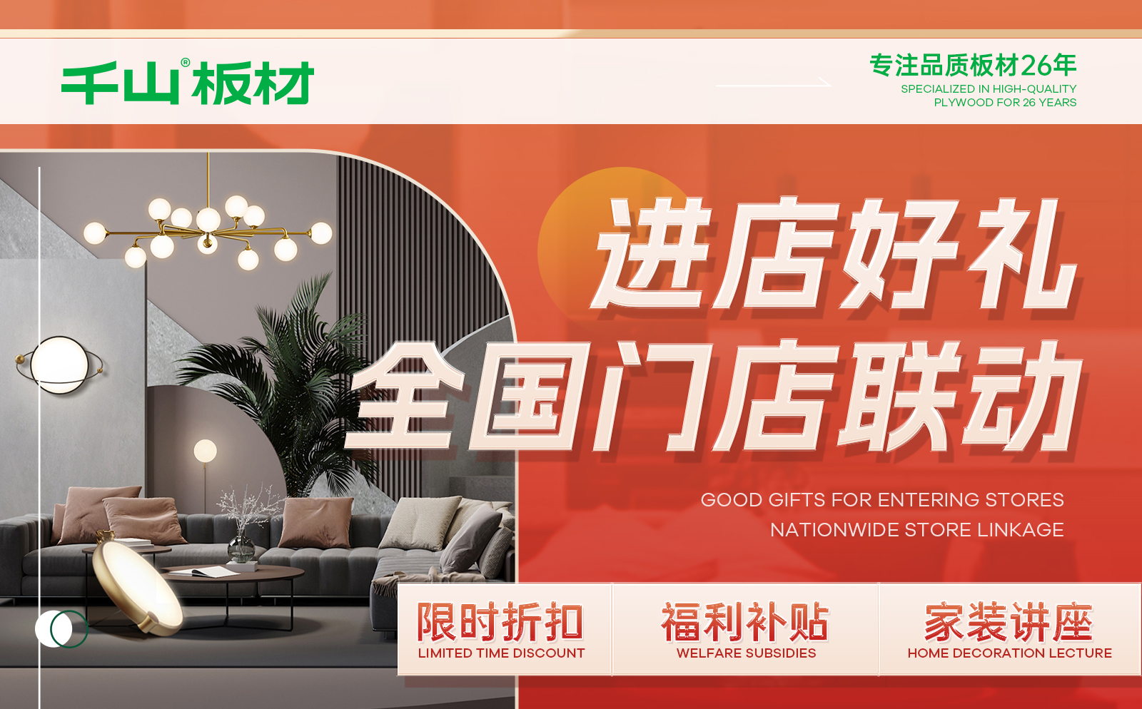 家裝節期間,千山板材全國線下門店將開展多種形式的現場體驗活動,限時折扣、福利補貼、家裝講座、進店好禮等火力全開,更有爆款套餐,掀起家裝熱浪!具體活動政策以終端門店為準,詳情咨詢千山板材全國各大授權門店。