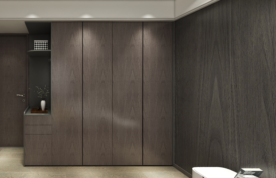 大面積純色柜體設計,摒棄繁冗,一門到頂延伸臥室空間感。星空璀璨,撫平喧囂靜臥安眠,而清晨細碎的陽光透過,斑斑點點,如穿過松樹林隙,自在輕盈。衣柜收納儲物功能齊全,合理利用臥室空間。無拉手設計,簡潔,立面平整與墻面融為一體,視覺效果開闊飽滿。