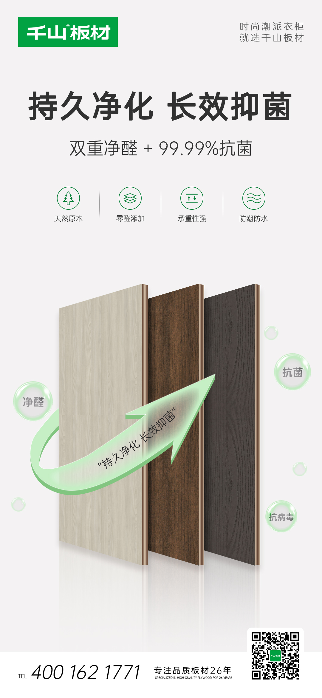 凈醛多層板擁有凈醛抗菌抗病毒超強飾面,能夠主動捕捉甲醛,并將其分解為二氧化碳和水,持久凈化室內空氣。通過抗菌抗病毒活性成分,抑制大腸桿菌、金黃色葡萄球菌等微生物生長,抗菌率及抗病毒活性率>99.9%,讓健康更“凈”一步!