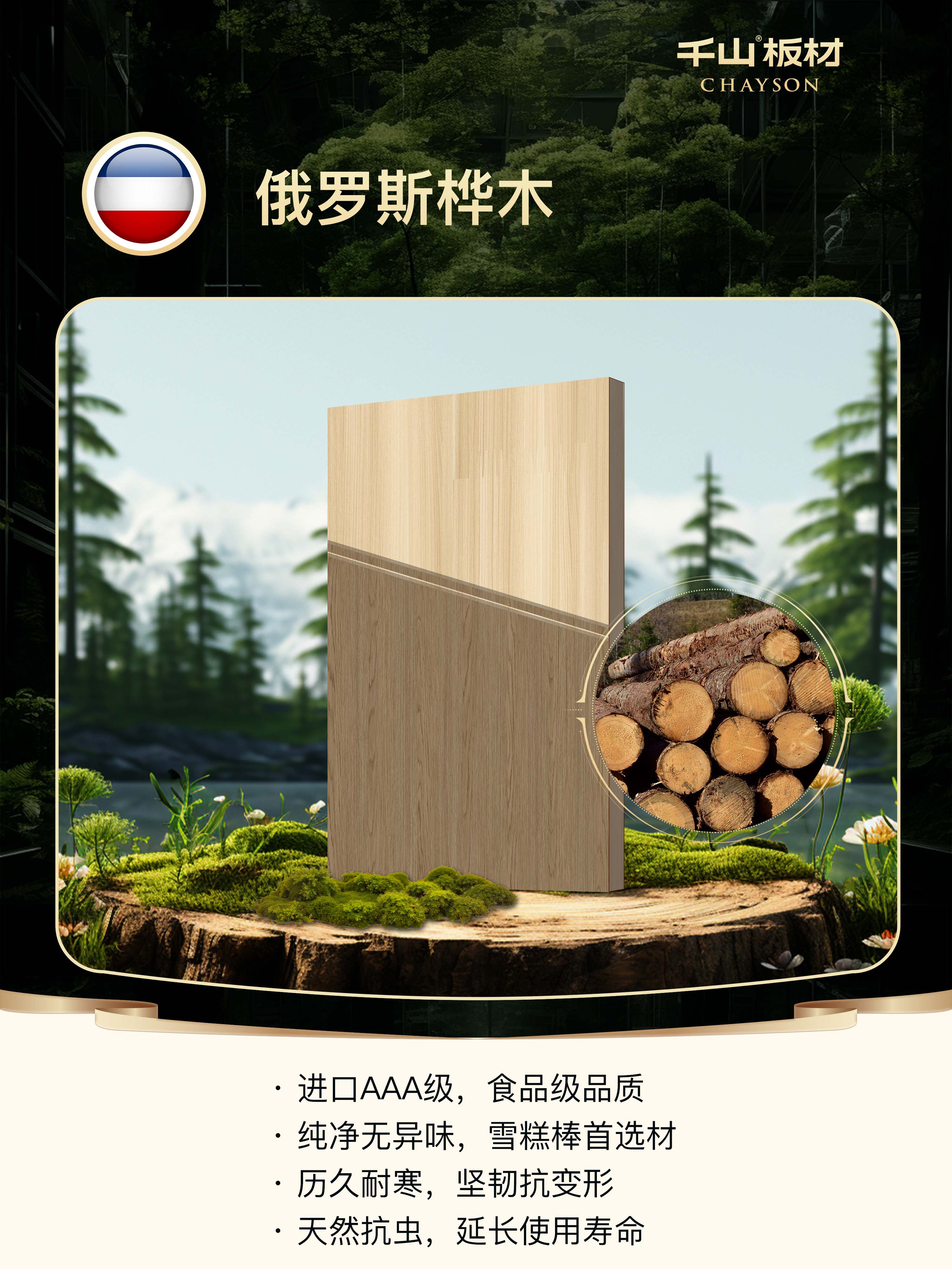 俄羅斯樺木生長在寒冷的環(huán)境中,具有更高的密度和硬度,結(jié)構(gòu)致密、材質(zhì)堅韌,是制作雪糕棒、木砧板等食品用材的理想材料,健康且耐磨耐用。
