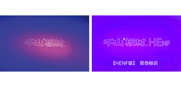 千山板材每張板材表面都印有隱形防偽標識,使用紫光手電筒照射板材表面,HENF級板材顯現(xiàn)“千山板材HENF”;ENF級和E0級板材顯現(xiàn)“千山板材”。