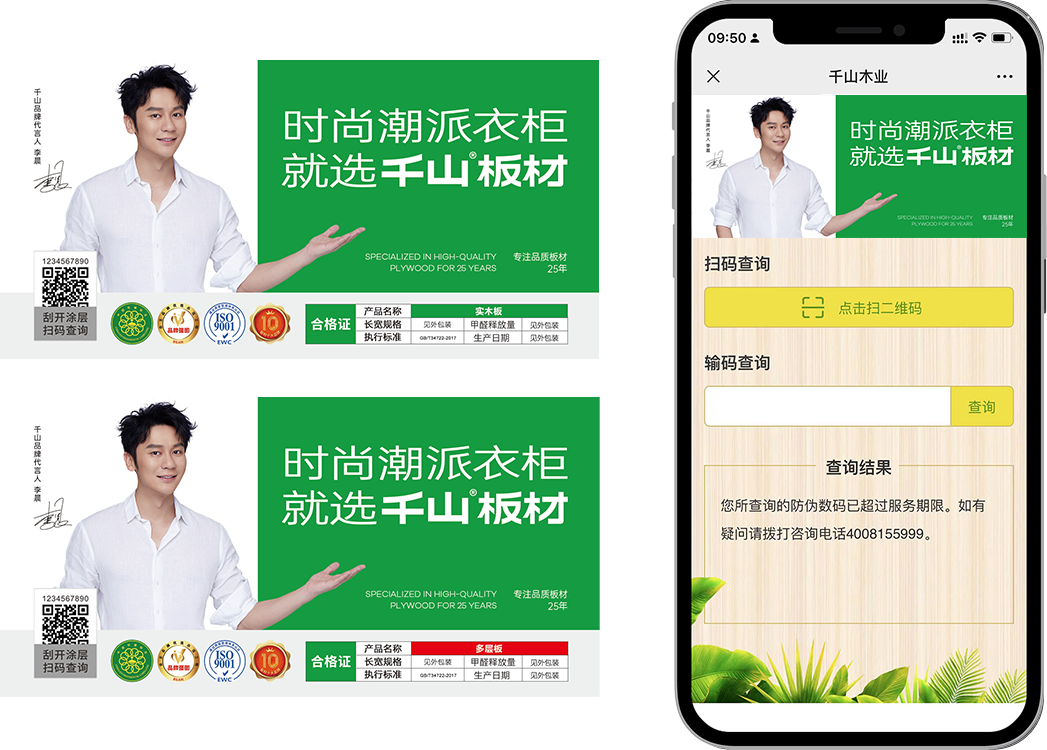 刮開涂層,掃描千山防偽商標二維碼,關(guān)注微信公眾號(千山板材),點擊防偽查詢,輸入16位或20位防偽碼。